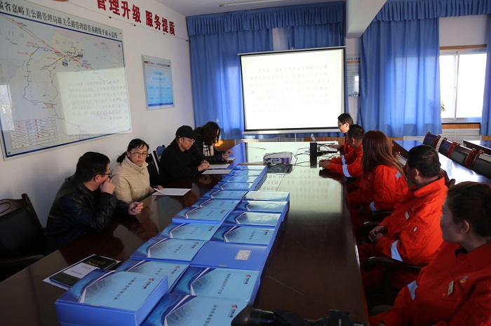 检查组首先实地观摩了嘉峪关养管站办公室、职工活动室、会议室等工作环境,查看了养管站管养线路图等,并对养管站的工作进行了解。检查组听取了养管站近年来创建工作专题汇报,特别是对以自主研发的破冰抛雪一体机为代表的一系列技术创新、设备改造、新材料运用等创新成果进行深入调研,并查阅了相关资料。